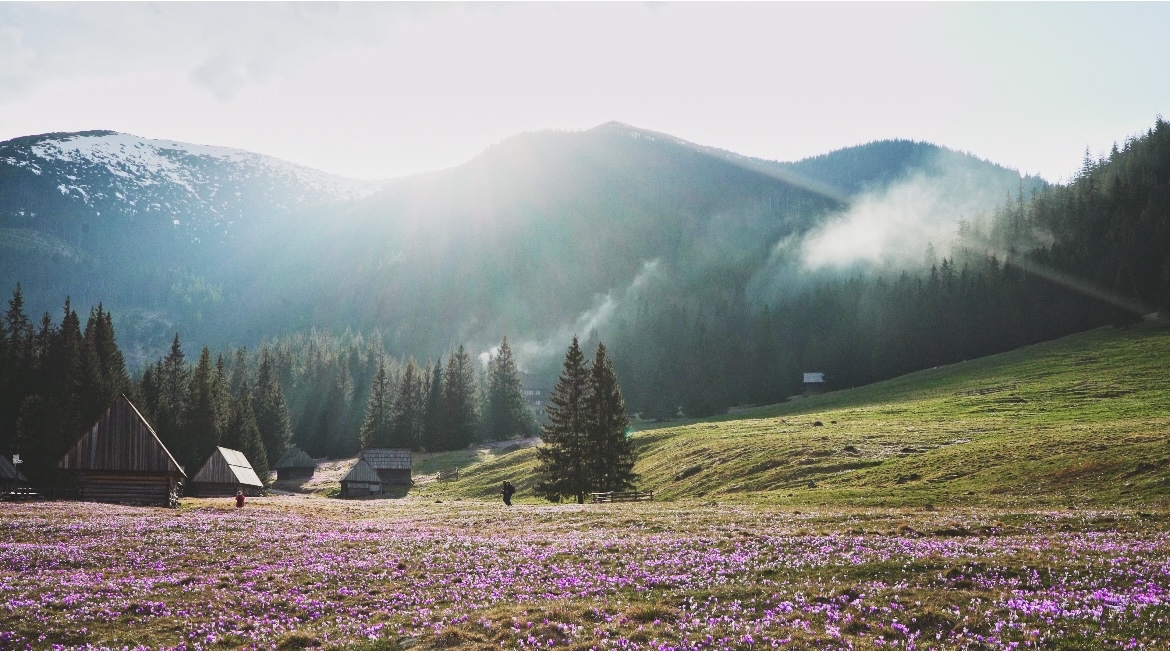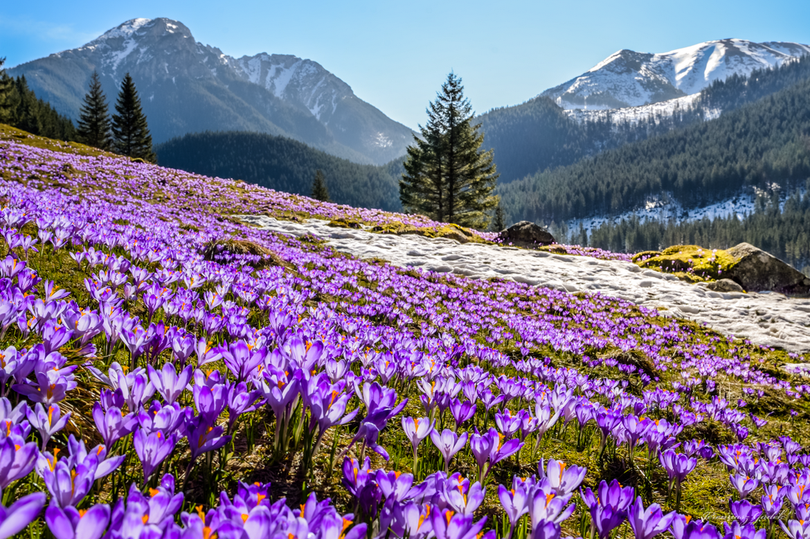 Galamērķis – Chochołowska pļava, kur pavasarī valda īpaša atmosfēra: kalni, svaigs gaiss un tūkstošiem ziedošu krokusu.