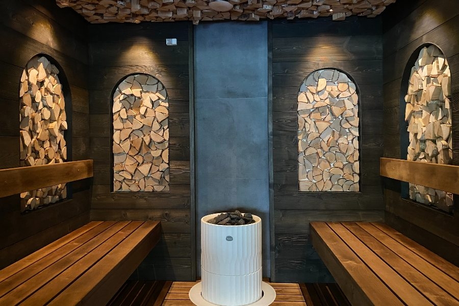 Можжевеловая баня. Низкая температура 55-65˚C и средняя влажность воздуха. На стенах элементы натурального можжевельника