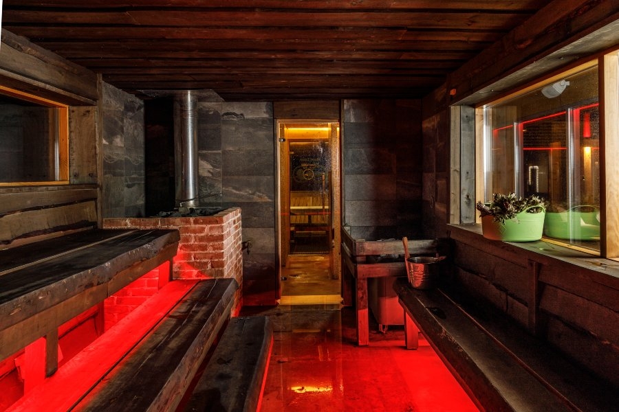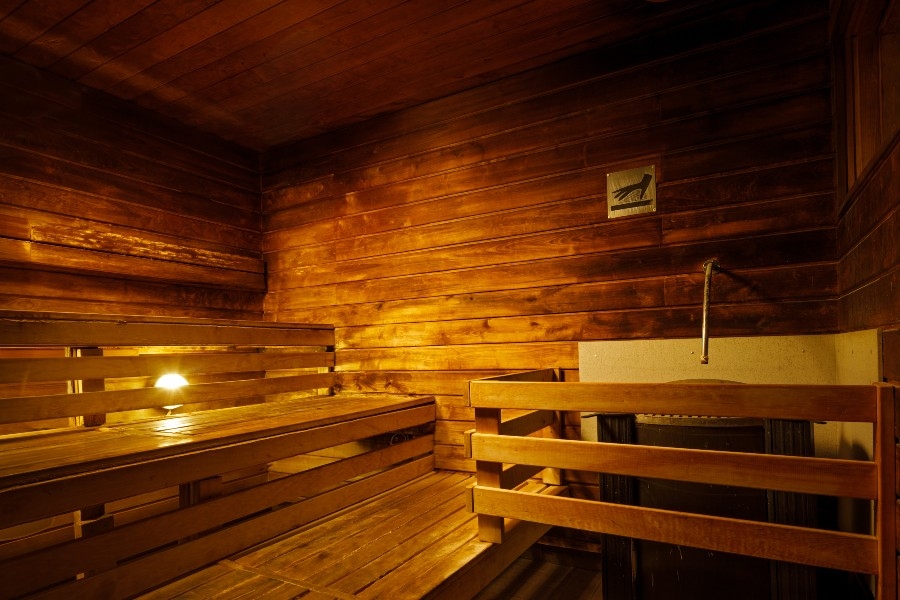 Финская баня. В бане низкий уровень влажности и температура варьируется в пределах 85-100˚C