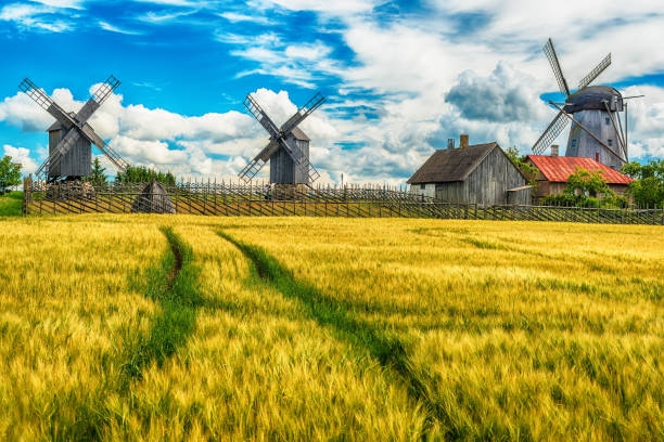 - Ветряные мельницы Англа - самые известные ветряные мельницы Сааремаа. В Англа находится единственная мельничная гора, сохранившая свой облик – место открытое всем ветрам, куда строились мельницы всей деревни. Четыре мельницы из пяти являются типичными для Сааремаа мельницами на ноге, построены в начале прошлого века. Посреди них стоит голландская мельница, построенная в 1927 году. Она немного выше.